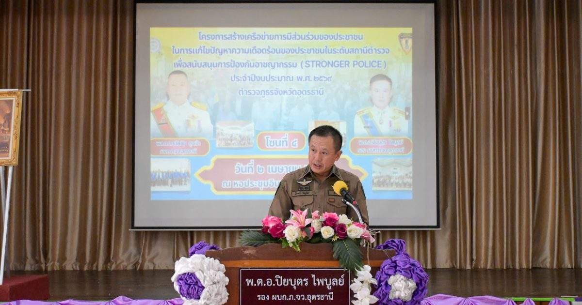 ของบ้านเมืองและการมีส่วนร่วมในกิจการตำรวจ (การก่อเกิด, การพัฒนา, การรักษา, การคงอยู่) ตามโครงการสร้างเครือข่ายการมีส่วนร่วมของประชาชนในการแก้ไขปัญหาความเดือดร้อนของประชาชนในระดับสถานีตำรวจ เพื่อสนับสนุนการป้องกันอาชญากรรม โซนที่ 4 โดย พ.ต.อ. ปิยบุตร ไพบูลย์ รอง ผบก.ภ.จว.อุดรธานี เป็นประธานในพิธี พร้อมกับให้โอวาทกับผู้เข้ารับฝึกอบรม จำนวน 250 คน ณ หอประชุมอินทรี กก.4 บก.กฝ.บช.ตชด. อำเภอเมืองอุดรธานี จังหวัดอุดรธานี