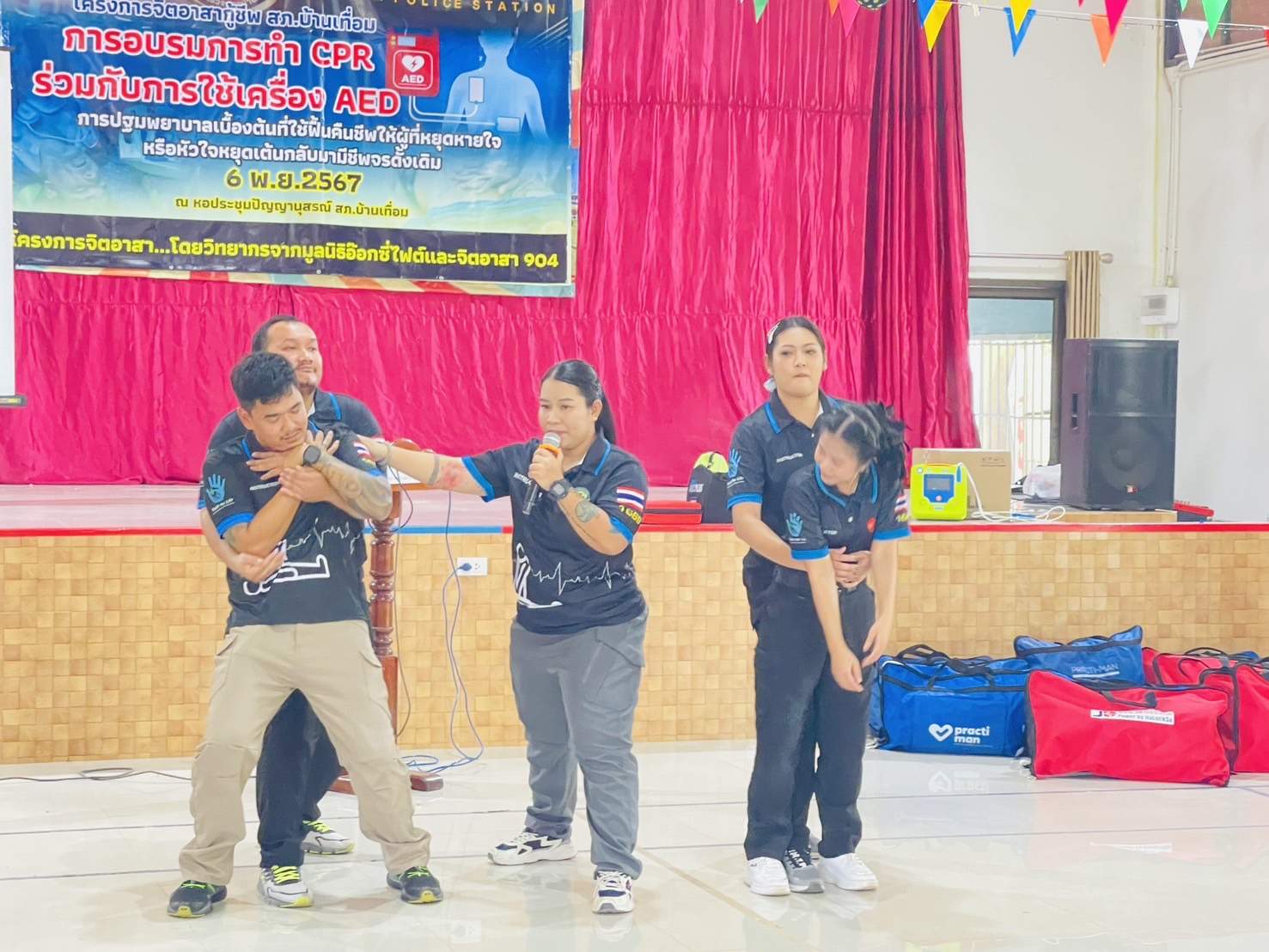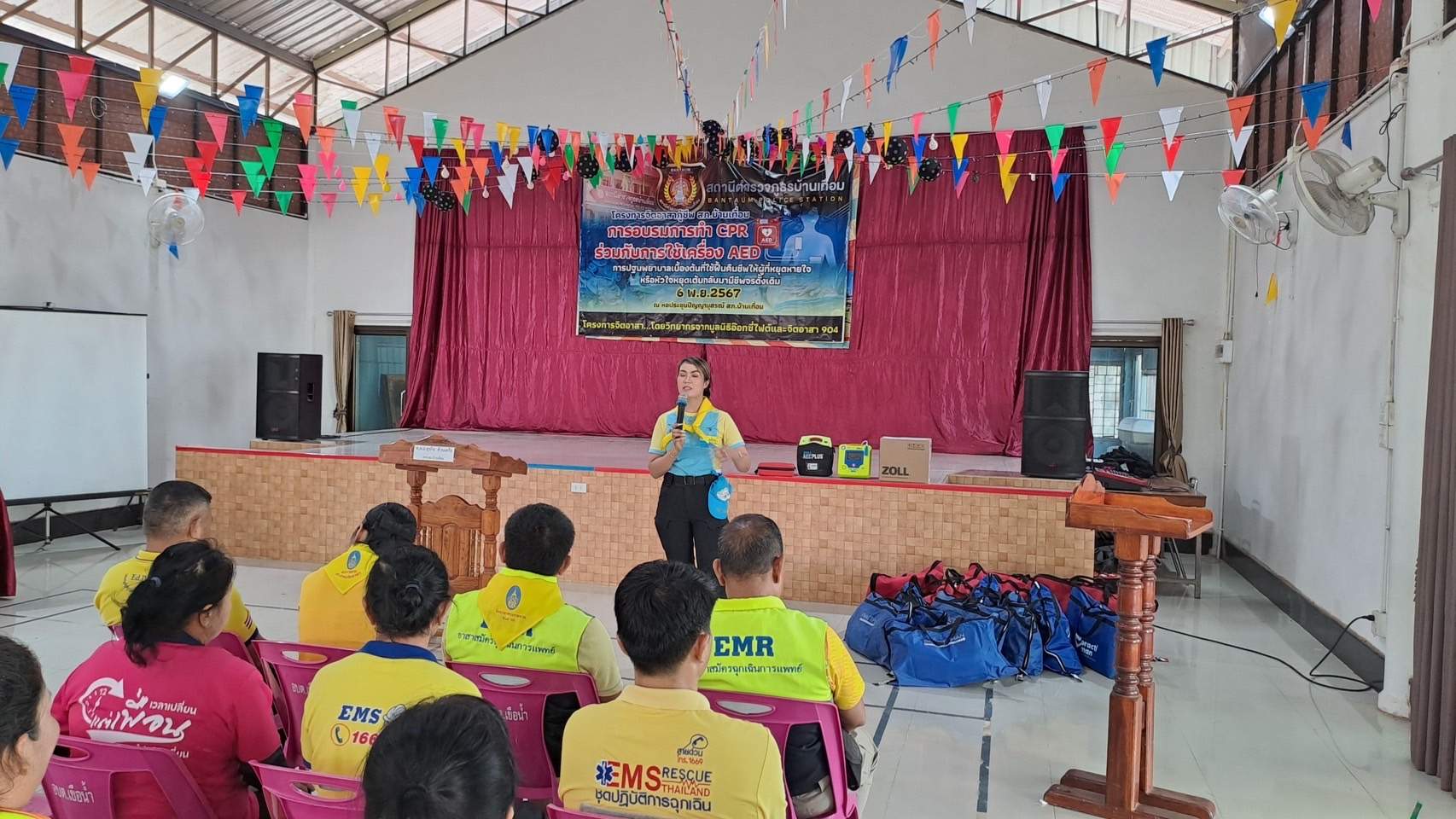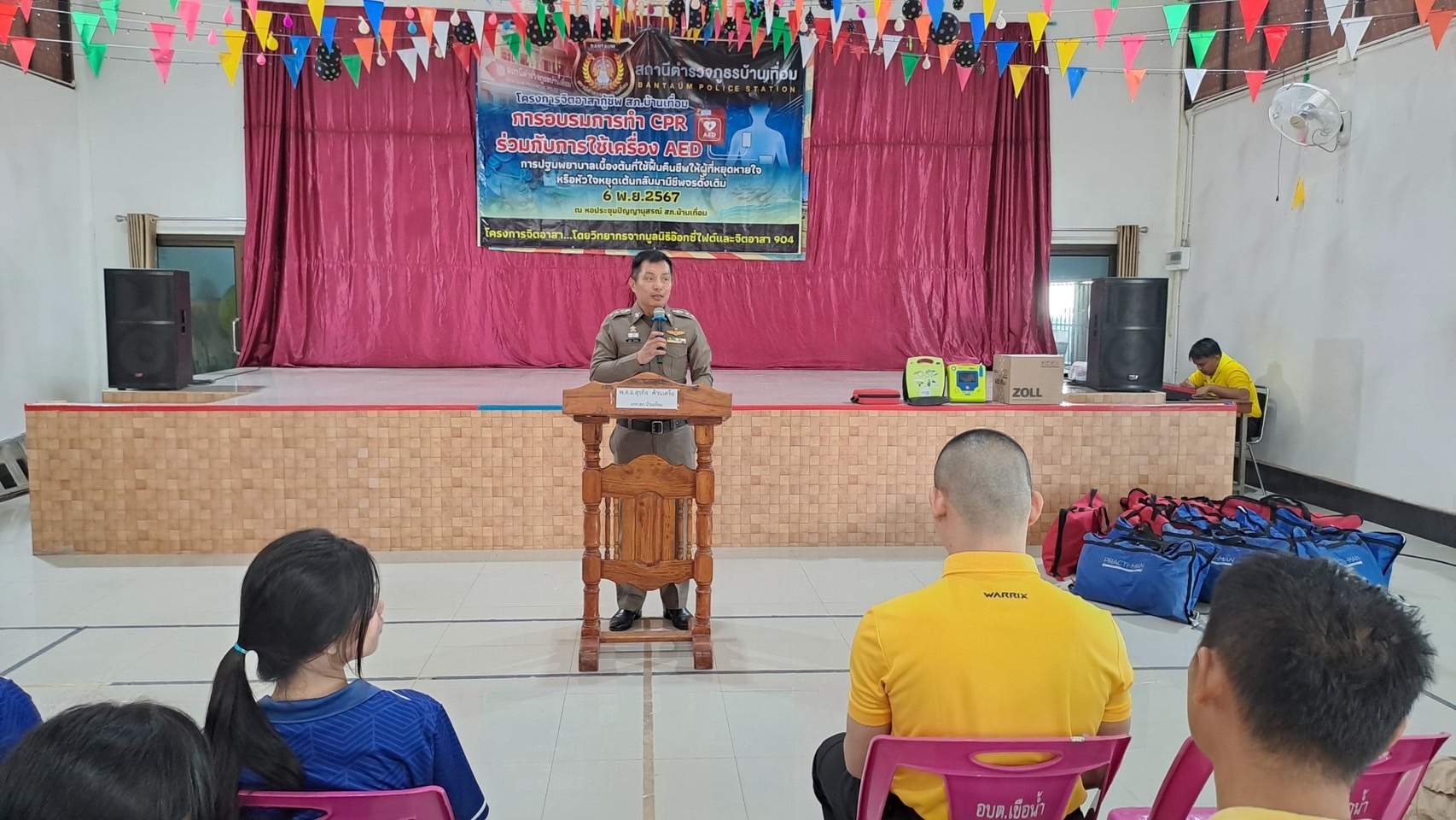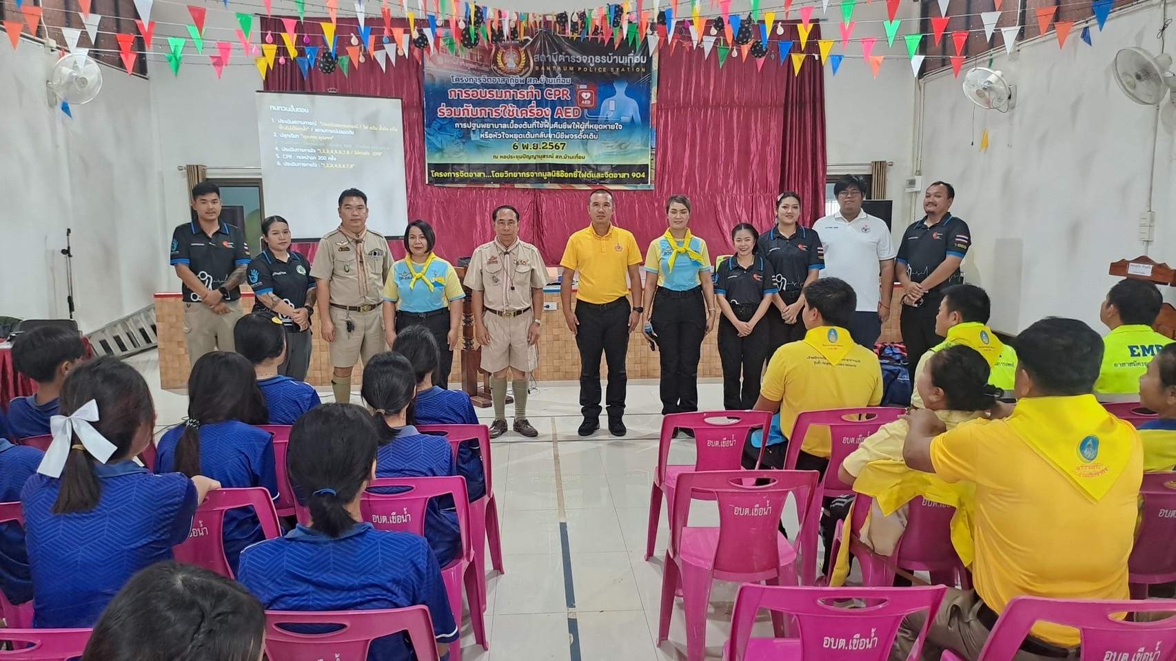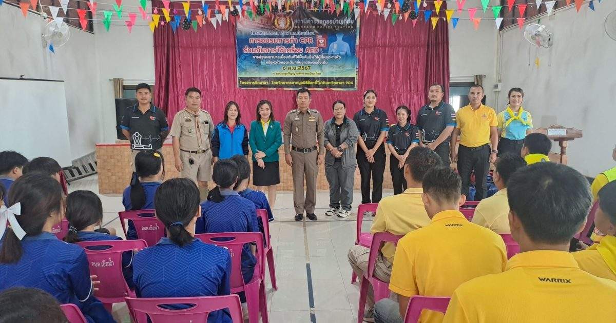 6 พ.ย.67 เวลา 08.00 – 12.00 น. น.ส.พิมพ์พัดชา ดวงลาพิมพ์ รหัส 5B-084 ผอ.กลุ่มลูกเสือ ยุวกาชาด และกิจการนักเรียน สังกัด สำนักงานศึกษาธิการจังหวัดอุดรธานี กระทรวงศึกษาธิการ พ.ต.ท. หญิง อสมาภรณ์ เกตุชุม สเตเกอร์ รหัส B-206 สว.อก.สภ.บ้านเทื่อม ตำรวจภูธรจังหวัดอุดรธานี จิตอาสา 904 พร้อมด้วย วิทยากรมูลนิธิอ๊อกซี่ไฟต์ ร่วมทำกิจกรรมเป็นวิทยากร โครงการ จิตอาสากู้ชีพ สถานีตำรวจภูธรบ้านเทื่อม เพื่อสนับสนุนการอบรมการทำ CPR ร่วมกับการใช้เครื่อง AED ในผู้ประสบการหยุดเต้นของหัวใจ และ การปฐมพยาบาลเบื้องต้นในกรณีอาหารติดคอ และวิธีห้ามเลือดด้วยการทำขันชะเนาะ โดยได้รับความอนุเคราะห์ เครื่องกระตุกไฟฟ้าหัวใจอัตโนมัติ หรือเครื่อง AED จากวัดทุ่งเศรษฐี และผู้มีจิตอาสาสนับสนุน จำนวน 1 เครื่อง เป็นเงินจำนวน 75,000.- (เจ็ดหมื่นห้าพันบาทถ้วน) จึงได้จัดอบรมข้าราชการตำรวจในสังกัด แม่บ้านตำรวจ นักเรียนชั้นมัธยมศึกษาปีที่ 3 จากโรงเรียนบ้านเทื่อม องค์กรภาครัฐ องค์กรปกครองส่วนท้องถิ่น และเอกชน ในพื้นที่รับผิดชอบ จำนวน 70 คน โดยมี พ.ต.อ. สุรกิจ ค้วนเครือ ผกก.สภ.บ้านเทื่อม เป็นประธานในพิธีเปิด ในวันพุธที่ 6 พฤศจิกายน 2567 ณ หอประชุมปัญญานุสรณ์ สถานีตำรวจภูธรบ้านเทื่อม ตำบลเขือน้ำ อำเภอบ้านผือ จังหวัดอุดรธานีโดยมีวัตถุประสงค์ ดังนี้.-