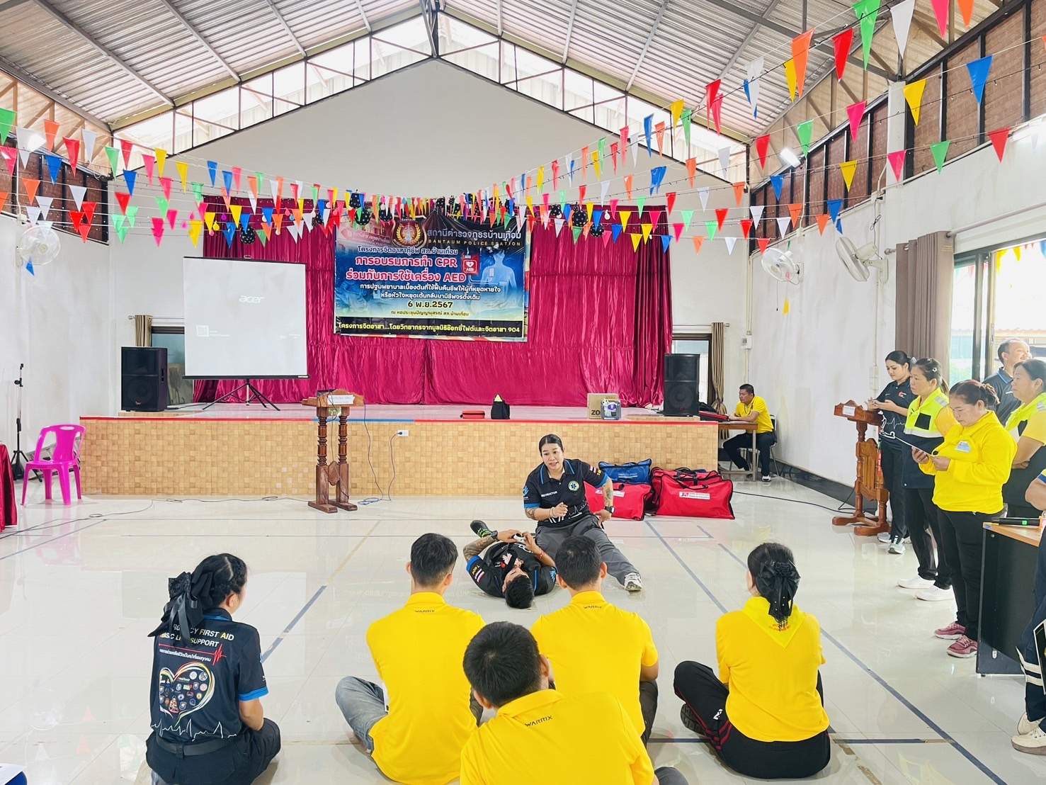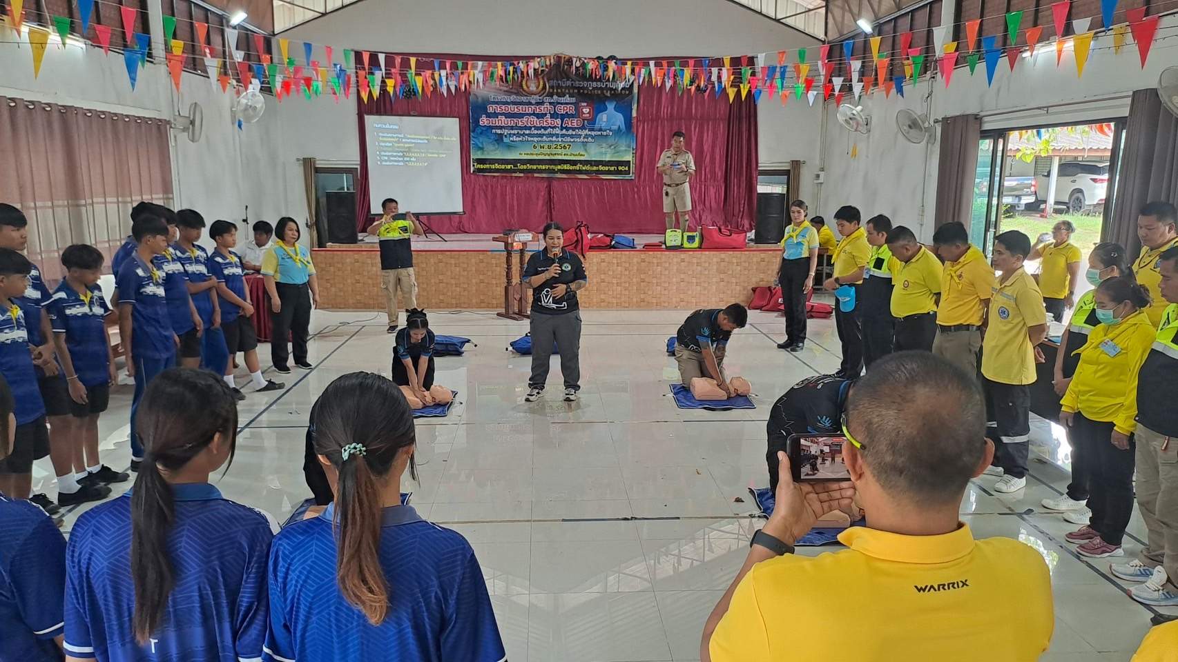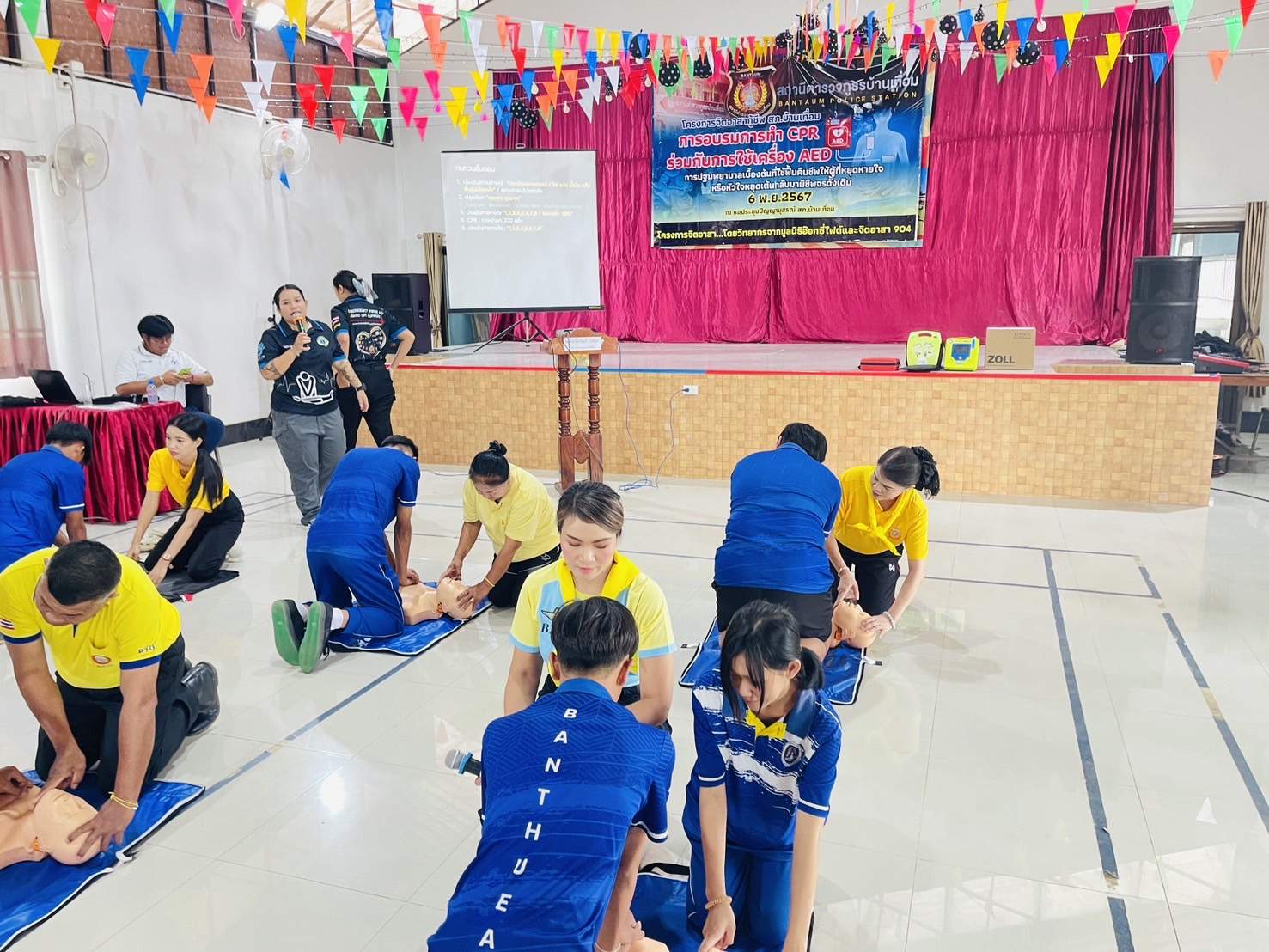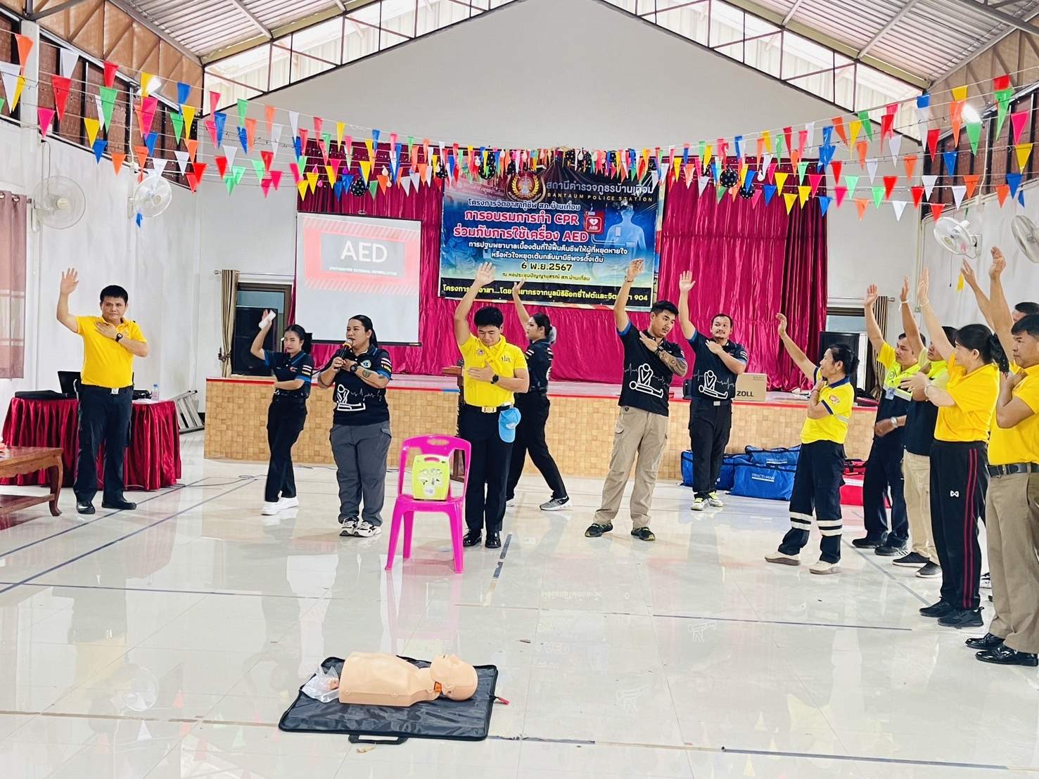 6 พ.ย.67 เวลา 08.00 – 12.00 น. น.ส.พิมพ์พัดชา ดวงลาพิมพ์ รหัส 5B-084 ผอ.กลุ่มลูกเสือ ยุวกาชาด และกิจการนักเรียน สังกัด สำนักงานศึกษาธิการจังหวัดอุดรธานี กระทรวงศึกษาธิการ พ.ต.ท. หญิง อสมาภรณ์ เกตุชุม สเตเกอร์ รหัส B-206 สว.อก.สภ.บ้านเทื่อม ตำรวจภูธรจังหวัดอุดรธานี จิตอาสา 904 พร้อมด้วย วิทยากรมูลนิธิอ๊อกซี่ไฟต์ ร่วมทำกิจกรรมเป็นวิทยากร โครงการ จิตอาสากู้ชีพ สถานีตำรวจภูธรบ้านเทื่อม เพื่อสนับสนุนการอบรมการทำ CPR ร่วมกับการใช้เครื่อง AED ในผู้ประสบการหยุดเต้นของหัวใจ และ การปฐมพยาบาลเบื้องต้นในกรณีอาหารติดคอ และวิธีห้ามเลือดด้วยการทำขันชะเนาะ โดยได้รับความอนุเคราะห์ เครื่องกระตุกไฟฟ้าหัวใจอัตโนมัติ หรือเครื่อง AED จากวัดทุ่งเศรษฐี และผู้มีจิตอาสาสนับสนุน จำนวน 1 เครื่อง เป็นเงินจำนวน 75,000.- (เจ็ดหมื่นห้าพันบาทถ้วน) จึงได้จัดอบรมข้าราชการตำรวจในสังกัด แม่บ้านตำรวจ นักเรียนชั้นมัธยมศึกษาปีที่ 3 จากโรงเรียนบ้านเทื่อม องค์กรภาครัฐ องค์กรปกครองส่วนท้องถิ่น และเอกชน ในพื้นที่รับผิดชอบ จำนวน 70 คน โดยมี พ.ต.อ. สุรกิจ ค้วนเครือ ผกก.สภ.บ้านเทื่อม เป็นประธานในพิธีเปิด ในวันพุธที่ 6 พฤศจิกายน 2567 ณ หอประชุมปัญญานุสรณ์ สถานีตำรวจภูธรบ้านเทื่อม ตำบลเขือน้ำ อำเภอบ้านผือ จังหวัดอุดรธานีโดยมีวัตถุประสงค์ ดังนี้.-
