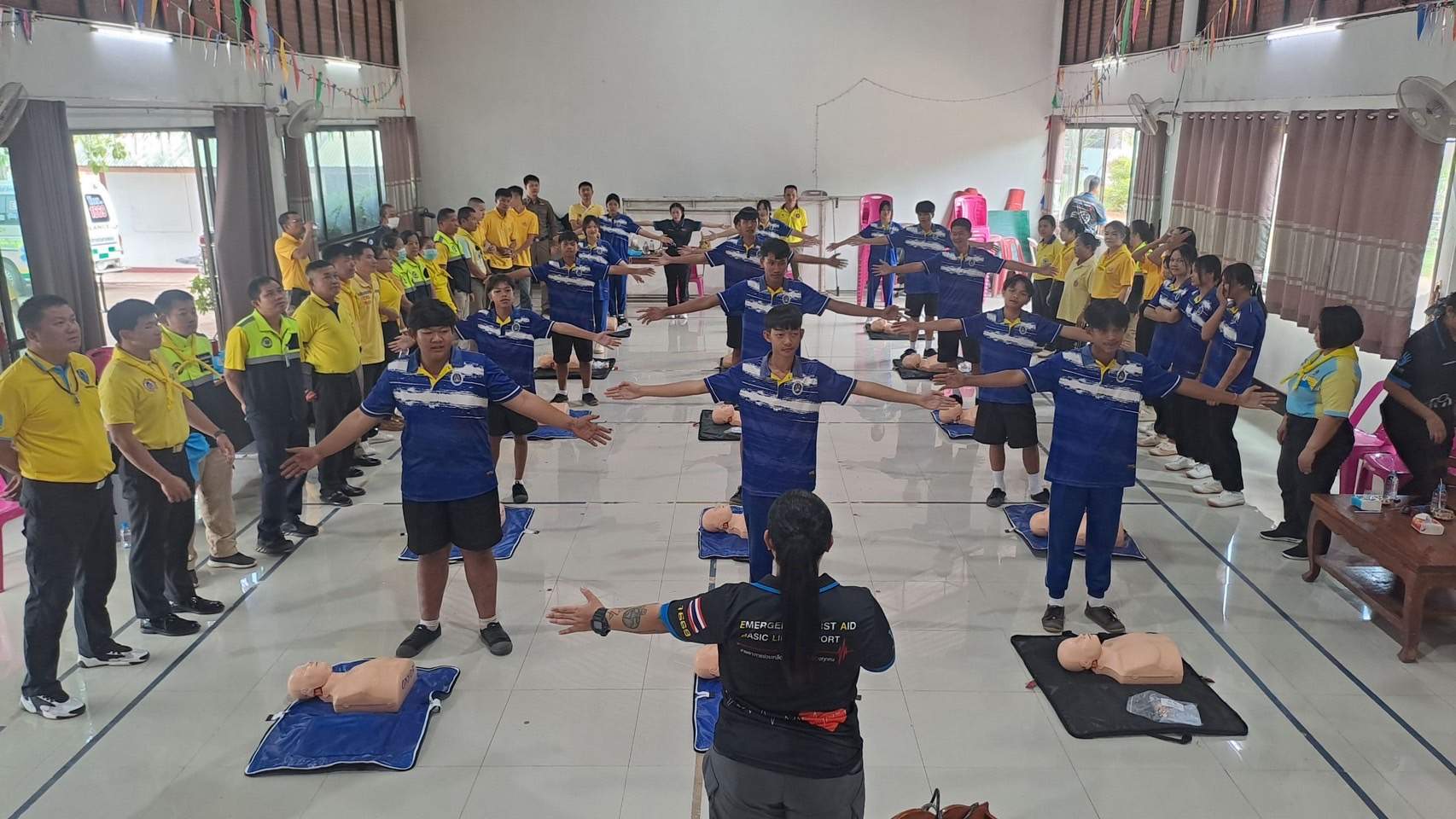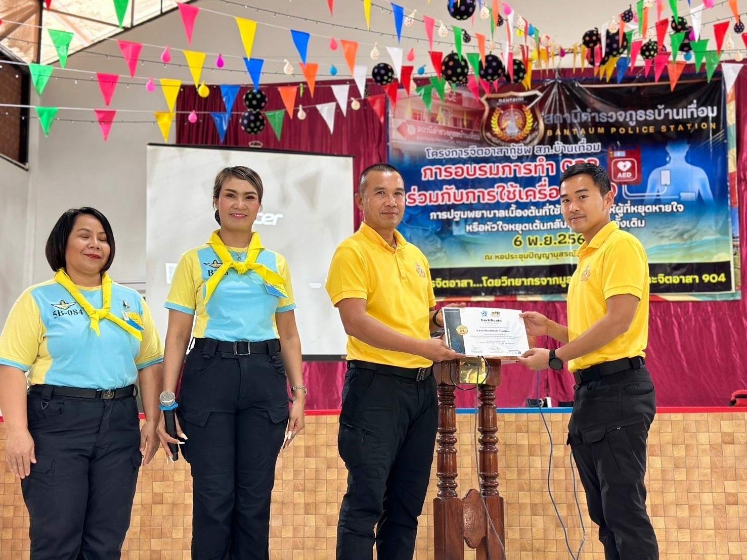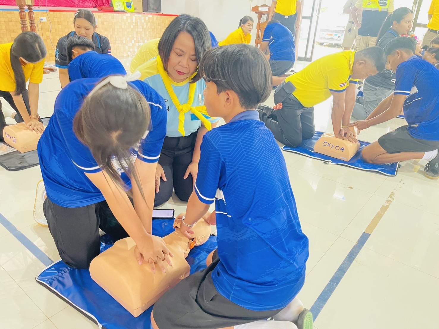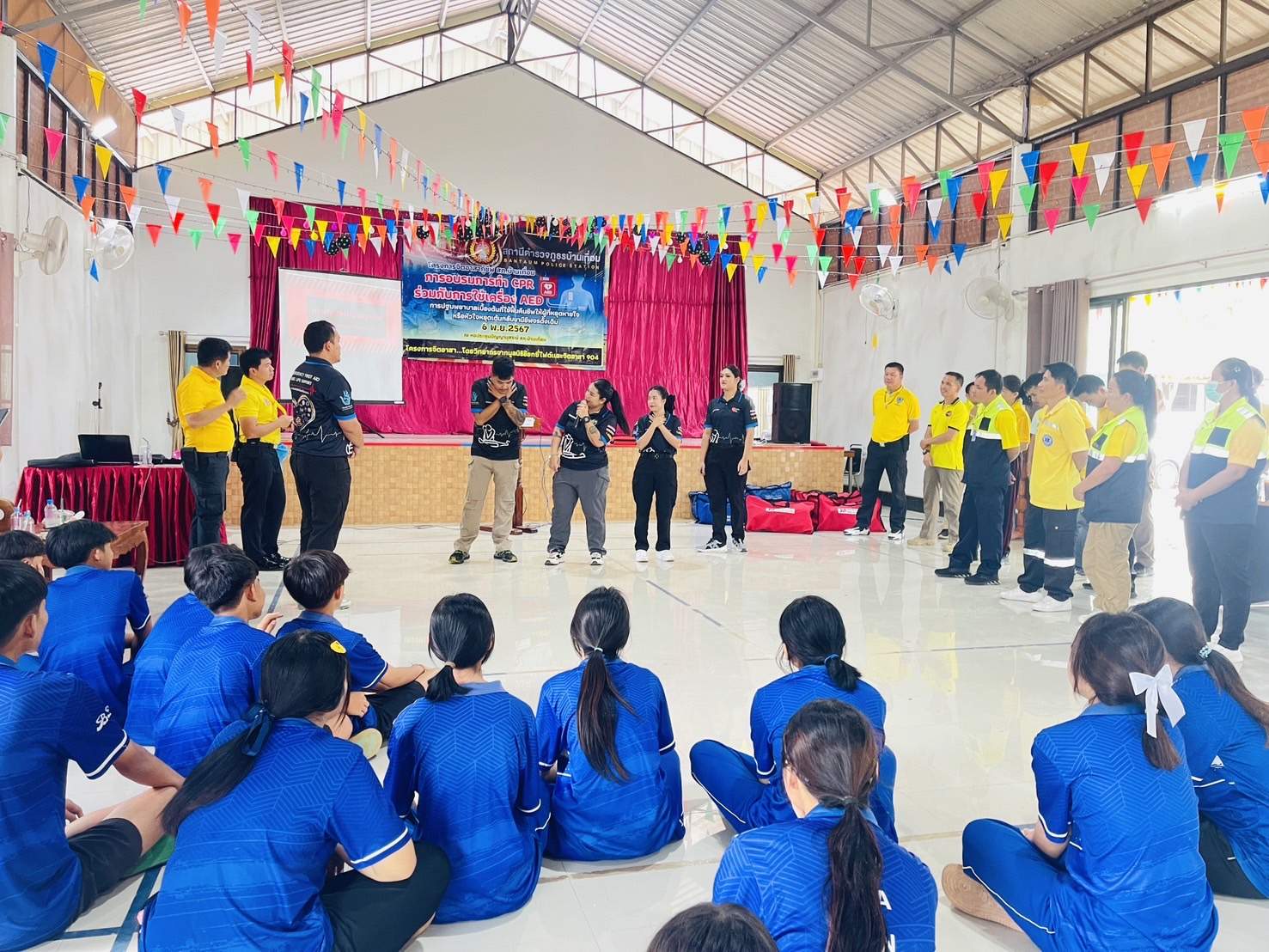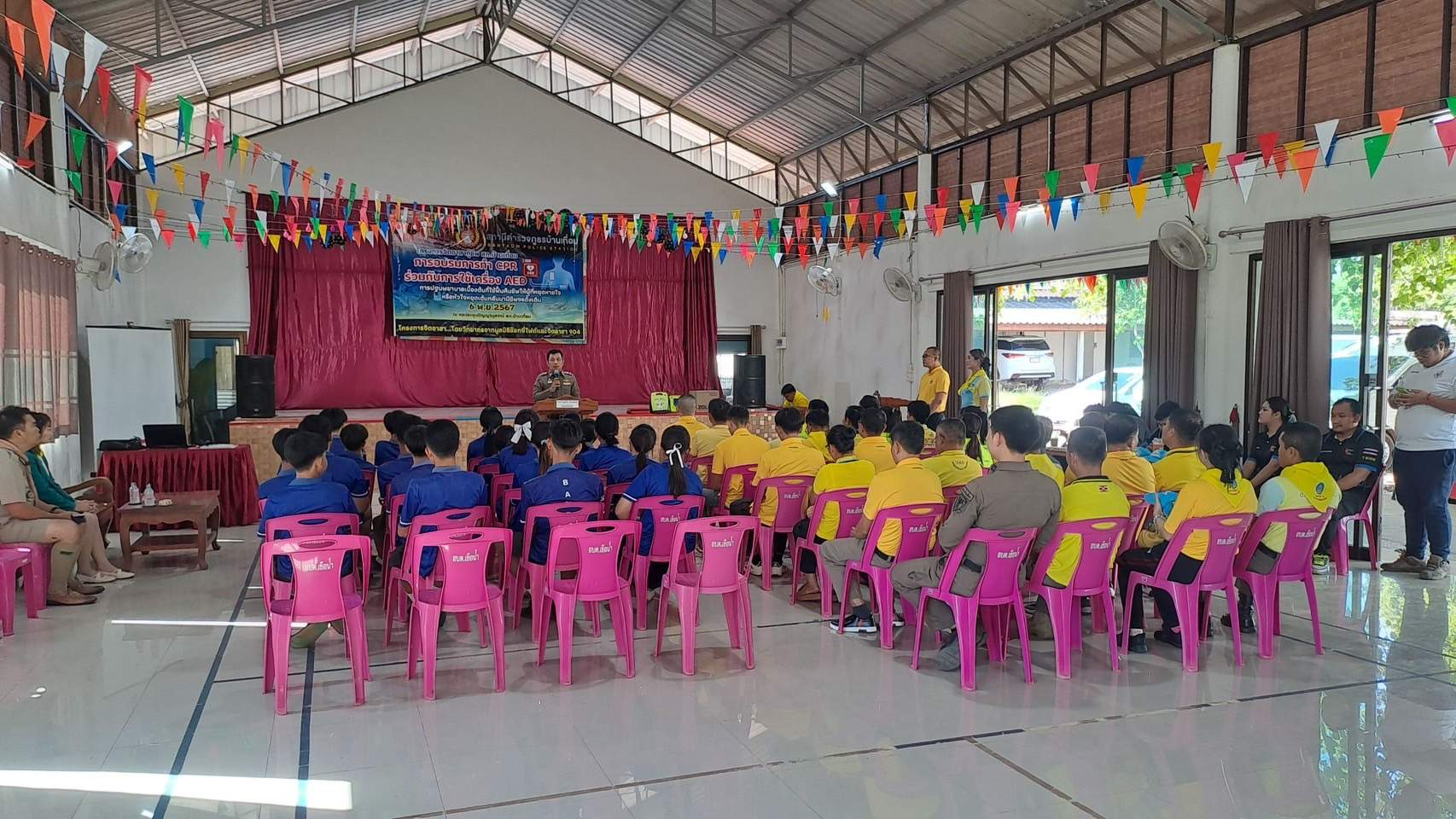 6 พ.ย.67 เวลา 08.00 – 12.00 น. น.ส.พิมพ์พัดชา ดวงลาพิมพ์ รหัส 5B-084 ผอ.กลุ่มลูกเสือ ยุวกาชาด และกิจการนักเรียน สังกัด สำนักงานศึกษาธิการจังหวัดอุดรธานี กระทรวงศึกษาธิการ พ.ต.ท. หญิง อสมาภรณ์ เกตุชุม สเตเกอร์ รหัส B-206 สว.อก.สภ.บ้านเทื่อม ตำรวจภูธรจังหวัดอุดรธานี จิตอาสา 904 พร้อมด้วย วิทยากรมูลนิธิอ๊อกซี่ไฟต์ ร่วมทำกิจกรรมเป็นวิทยากร โครงการ จิตอาสากู้ชีพ สถานีตำรวจภูธรบ้านเทื่อม เพื่อสนับสนุนการอบรมการทำ CPR ร่วมกับการใช้เครื่อง AED ในผู้ประสบการหยุดเต้นของหัวใจ และ การปฐมพยาบาลเบื้องต้นในกรณีอาหารติดคอ และวิธีห้ามเลือดด้วยการทำขันชะเนาะ โดยได้รับความอนุเคราะห์ เครื่องกระตุกไฟฟ้าหัวใจอัตโนมัติ หรือเครื่อง AED จากวัดทุ่งเศรษฐี และผู้มีจิตอาสาสนับสนุน จำนวน 1 เครื่อง เป็นเงินจำนวน 75,000.- (เจ็ดหมื่นห้าพันบาทถ้วน) จึงได้จัดอบรมข้าราชการตำรวจในสังกัด แม่บ้านตำรวจ นักเรียนชั้นมัธยมศึกษาปีที่ 3 จากโรงเรียนบ้านเทื่อม องค์กรภาครัฐ องค์กรปกครองส่วนท้องถิ่น และเอกชน ในพื้นที่รับผิดชอบ จำนวน 70 คน โดยมี พ.ต.อ. สุรกิจ ค้วนเครือ ผกก.สภ.บ้านเทื่อม เป็นประธานในพิธีเปิด ในวันพุธที่ 6 พฤศจิกายน 2567 ณ หอประชุมปัญญานุสรณ์ สถานีตำรวจภูธรบ้านเทื่อม ตำบลเขือน้ำ อำเภอบ้านผือ จังหวัดอุดรธานีโดยมีวัตถุประสงค์ ดังนี้.-