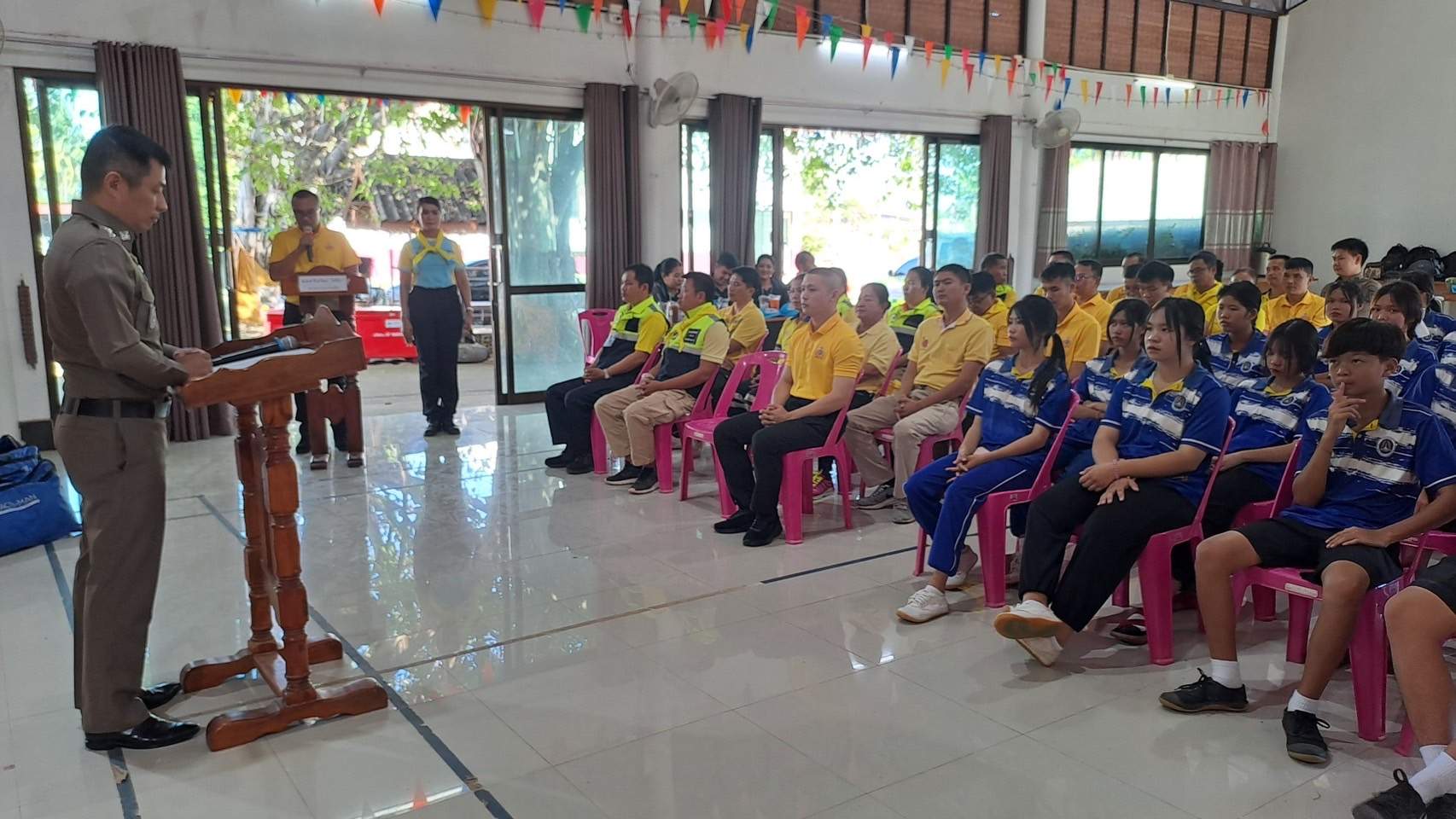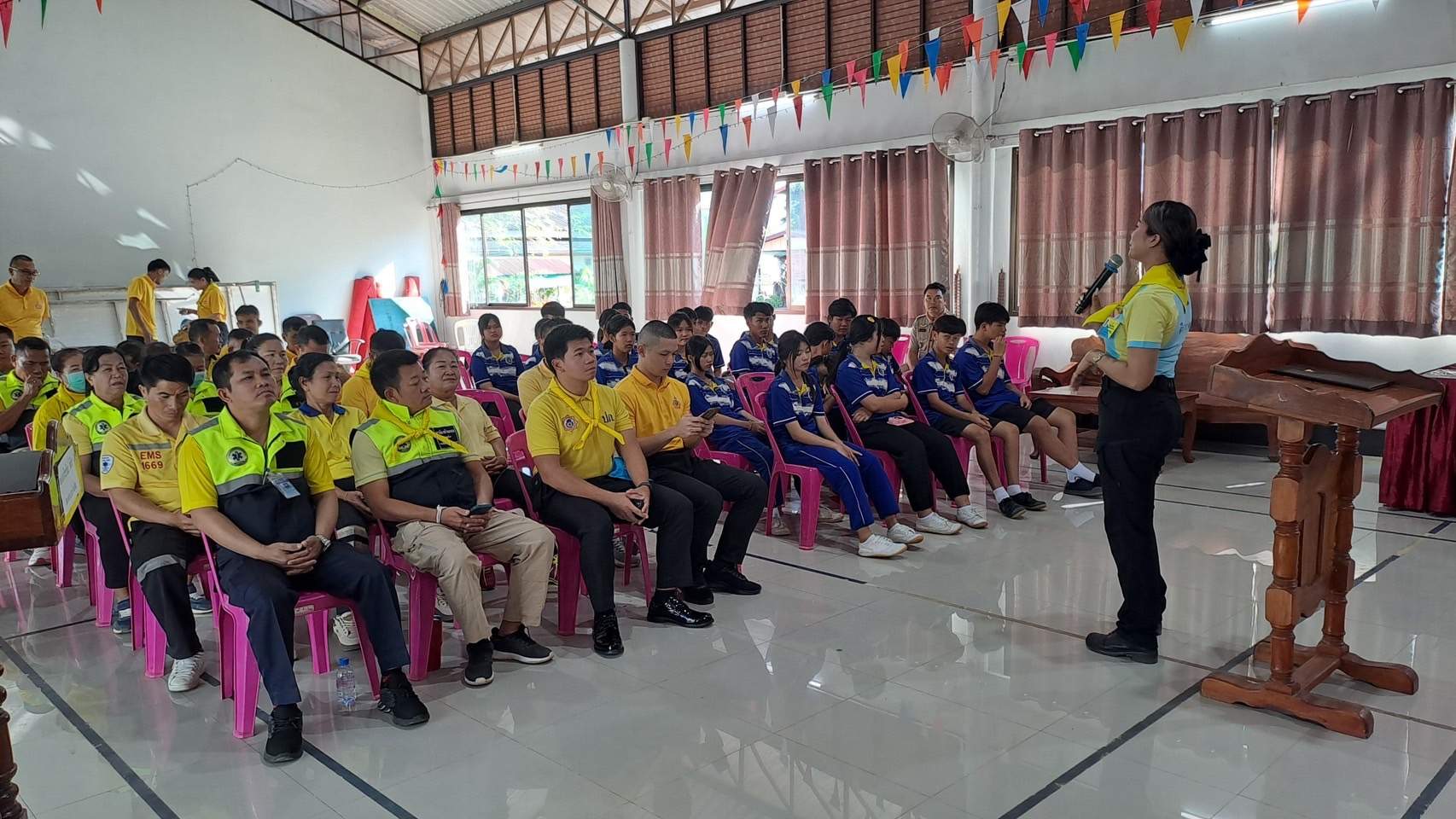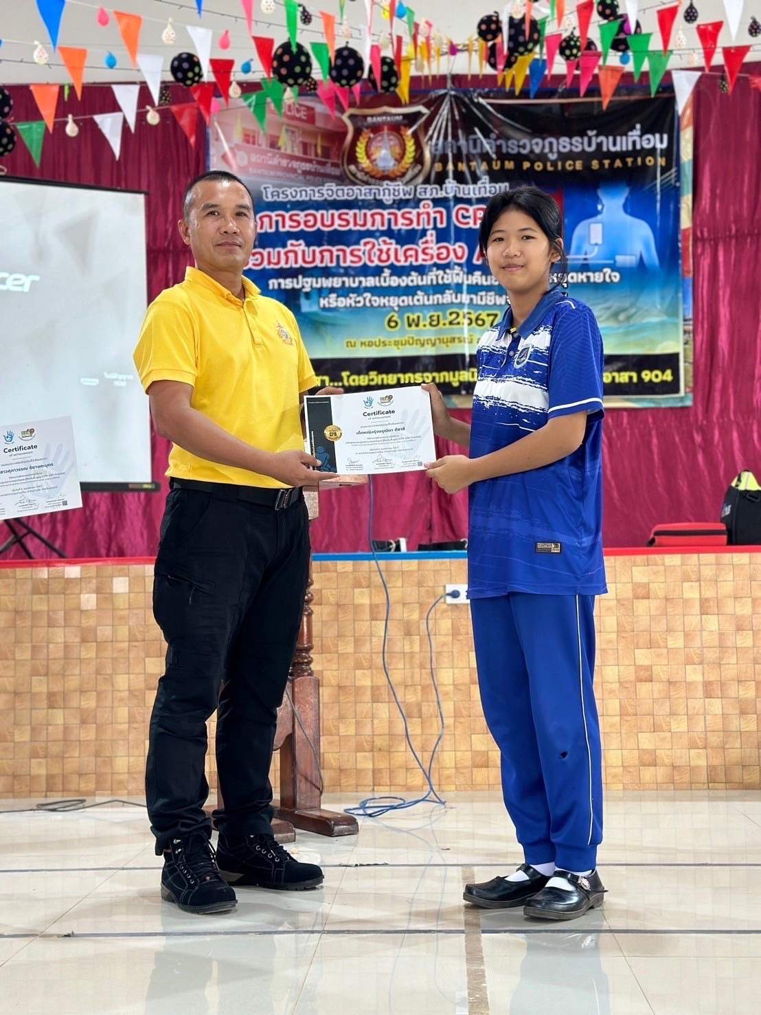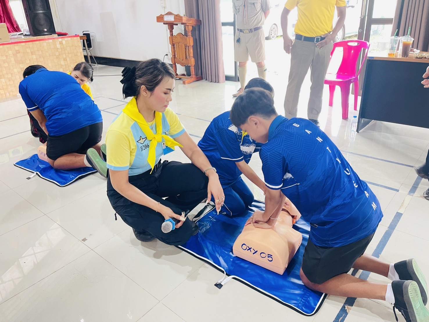 6 พ.ย.67 เวลา 08.00 – 12.00 น. น.ส.พิมพ์พัดชา ดวงลาพิมพ์ รหัส 5B-084 ผอ.กลุ่มลูกเสือ ยุวกาชาด และกิจการนักเรียน สังกัด สำนักงานศึกษาธิการจังหวัดอุดรธานี กระทรวงศึกษาธิการ พ.ต.ท. หญิง อสมาภรณ์ เกตุชุม สเตเกอร์ รหัส B-206 สว.อก.สภ.บ้านเทื่อม ตำรวจภูธรจังหวัดอุดรธานี จิตอาสา 904 พร้อมด้วย วิทยากรมูลนิธิอ๊อกซี่ไฟต์ ร่วมทำกิจกรรมเป็นวิทยากร โครงการ จิตอาสากู้ชีพ สถานีตำรวจภูธรบ้านเทื่อม เพื่อสนับสนุนการอบรมการทำ CPR ร่วมกับการใช้เครื่อง AED ในผู้ประสบการหยุดเต้นของหัวใจ และ การปฐมพยาบาลเบื้องต้นในกรณีอาหารติดคอ และวิธีห้ามเลือดด้วยการทำขันชะเนาะ โดยได้รับความอนุเคราะห์ เครื่องกระตุกไฟฟ้าหัวใจอัตโนมัติ หรือเครื่อง AED จากวัดทุ่งเศรษฐี และผู้มีจิตอาสาสนับสนุน จำนวน 1 เครื่อง เป็นเงินจำนวน 75,000.- (เจ็ดหมื่นห้าพันบาทถ้วน) จึงได้จัดอบรมข้าราชการตำรวจในสังกัด แม่บ้านตำรวจ นักเรียนชั้นมัธยมศึกษาปีที่ 3 จากโรงเรียนบ้านเทื่อม องค์กรภาครัฐ องค์กรปกครองส่วนท้องถิ่น และเอกชน ในพื้นที่รับผิดชอบ จำนวน 70 คน โดยมี พ.ต.อ. สุรกิจ ค้วนเครือ ผกก.สภ.บ้านเทื่อม เป็นประธานในพิธีเปิด ในวันพุธที่ 6 พฤศจิกายน 2567 ณ หอประชุมปัญญานุสรณ์ สถานีตำรวจภูธรบ้านเทื่อม ตำบลเขือน้ำ อำเภอบ้านผือ จังหวัดอุดรธานีโดยมีวัตถุประสงค์ ดังนี้.-