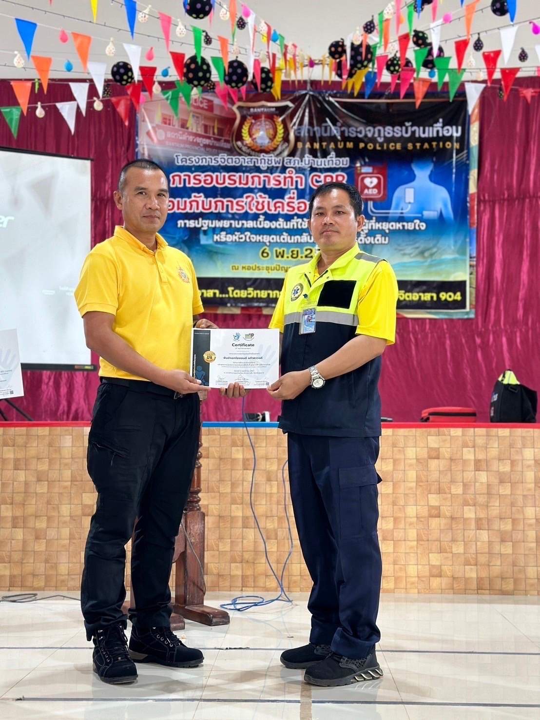 ผลการปฏิบัติ : เป็นไปด้วยความเรียบร้อย ผู้เข้ารับการฝึกอบรม มีความรู้ความเข้าใจ ตั้งใจฝึกอบรมจนสามารถปฏิบัติได้อย่างถูกต้อง มีความมั่นใจว่าจะสามารถช่วยเหลือผู้ประสบการหยุดเต้นของหัวใจได้